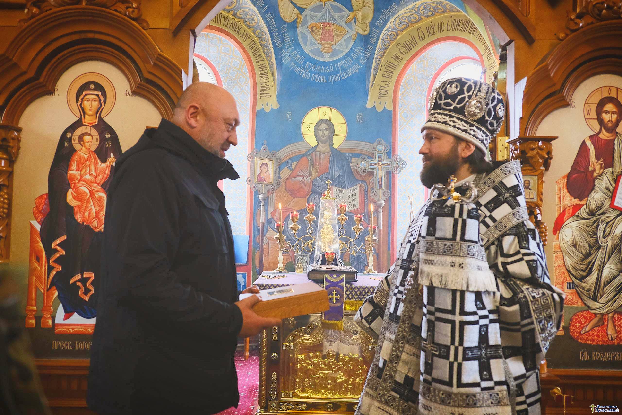 В конце богослужения командир казачьего добровольческого отряда БАРС-32 им. П. А. Судоплатова Александр Николаевич Новохатский (позывной «Грифон») преподнес в дар владыке Петру памятный набор из панагии и креста.